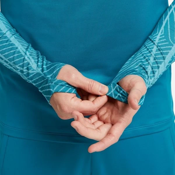 - Viertellanger Reißverschluss für einen aufrechten Kragen und Daumenlöcher für eine bequeme Passform, die ihre Form behält